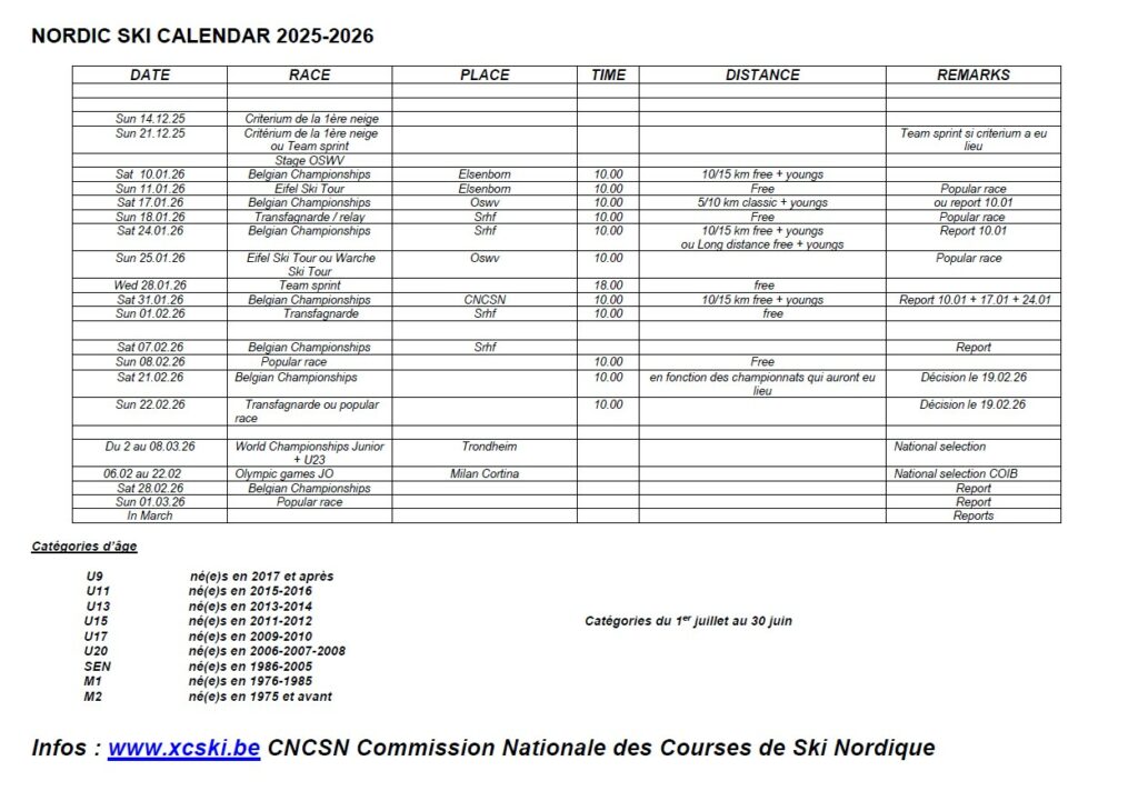 The Nordic Ski Calendar for 2025–2026 provides the official list of cross-country skiing events in Belgium. It features key dates and race details to help enthusiasts plan their participation. For complete information on the upcoming season, visit the website or the facebook page to explore the full program and find specific race locations.